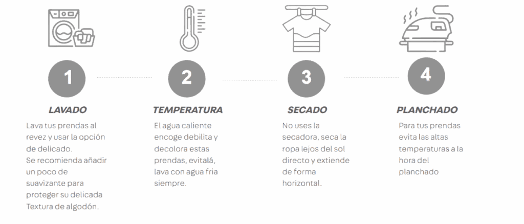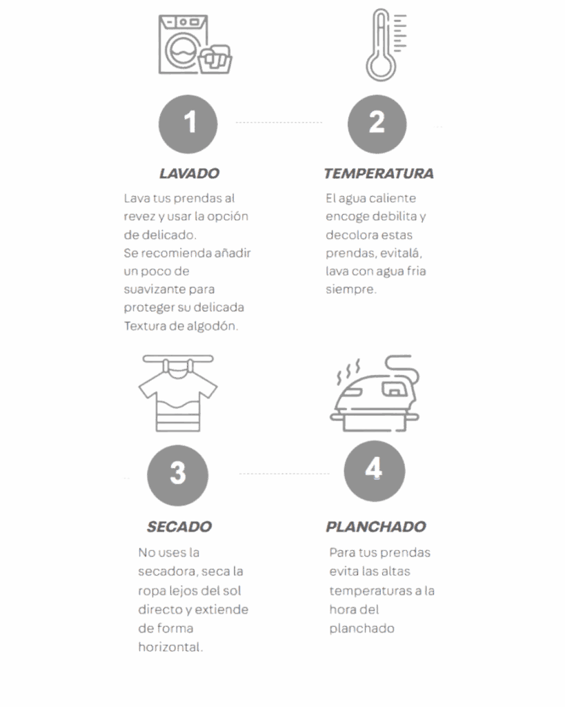 Nuestros polos están hechos de algodón y necesitan un cuidado especial para que mantenga su forma y color el máximo tiempo posible. Aquí veras unos sencillos pasos para disfrutar tu polo como recien comprados.